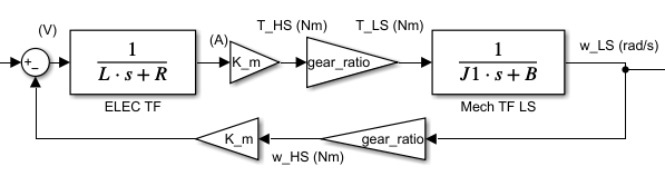 We’re using the low speed version of the mechanical transfer function, and therefore must multiply the torque by the gear ratio before entering the mechanical TF (since the torque is greater on the higher gear side of the gearbox). In the feedback loop we must multiply by the gear ratio to account for the increased speed on the low gear side of the gearbox. The values shown in the diagram above are listed in the actuator section of this report.