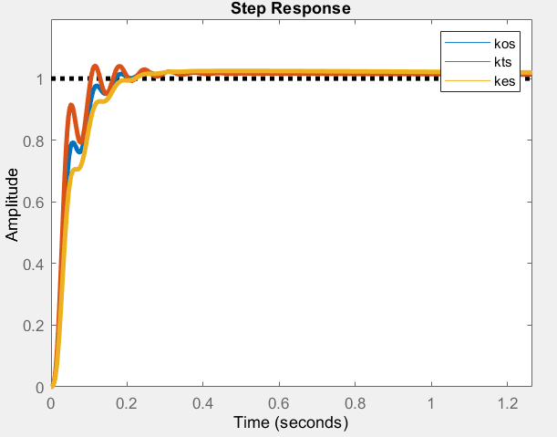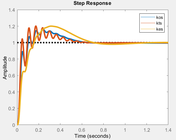 Using step 7 in the CDEs function, let's generate three step responses optimizing for different qualities–overshoot (kos), settle time(kts) and steady-state error(kes).