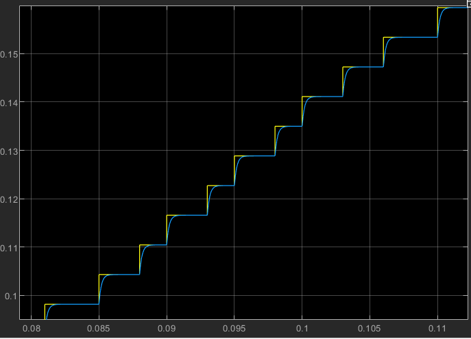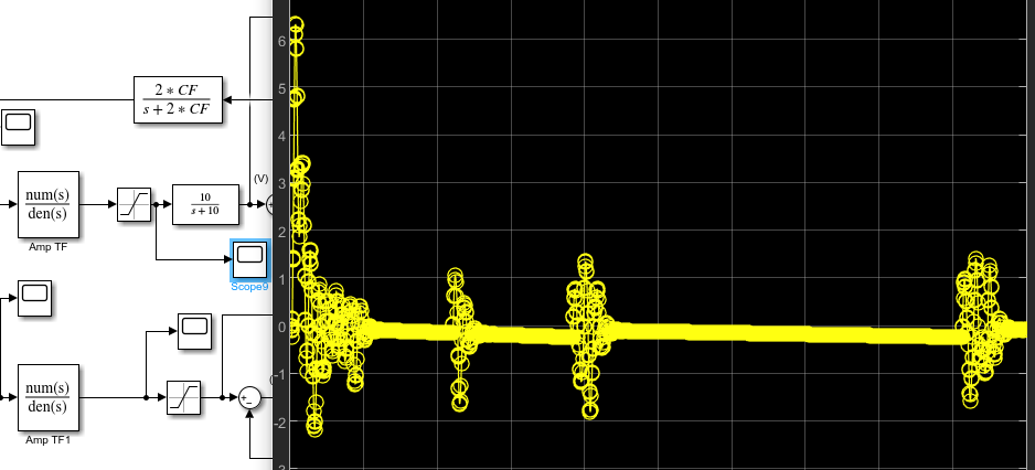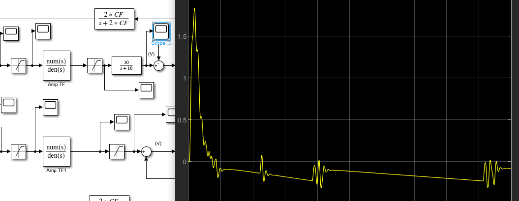 We notice that it's much more difficult to get a successful simulation with all these added nonlinearities. Normally the amplifier acted as sort of low pass filter to smooth out the PWM data from the PID, however with all these added nonlinearities the output of the amplifier remains unsmooth: