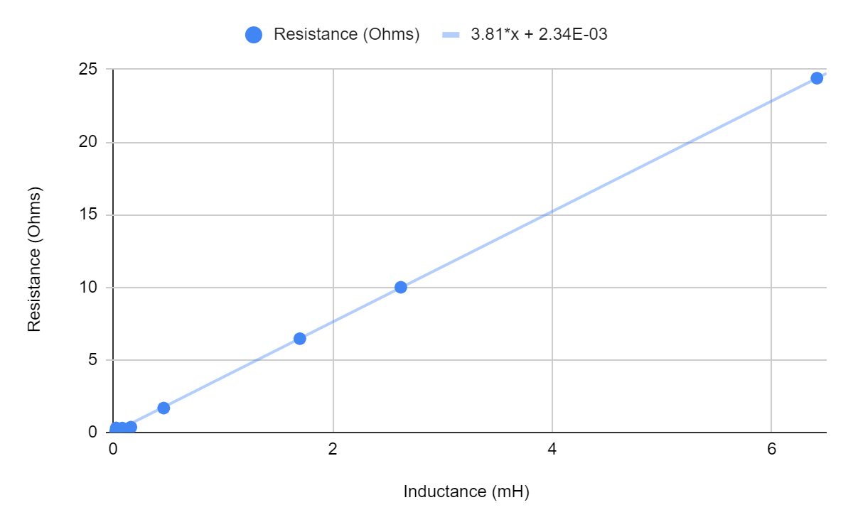 A representative sample of motors was sampled from the Maxon catalog, and the relationship between their resistances and inductances was plotted. The relationship was observed to be approximately linear. Performing a linear regression and plugging in our calculated R, we get L = 0.059155 mH.